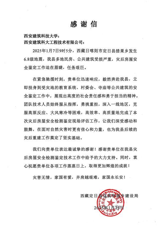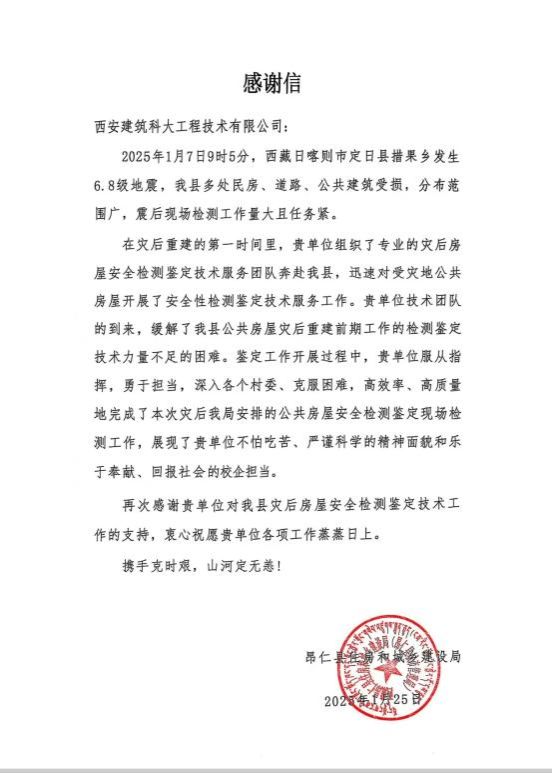 1月26日,定日县、昂仁县住建局向公司致信,称赞技术服务团队“以精湛技术筑牢安全防线,用建大情怀温暖雪域高原”,其高效工作为灾后重建工作奠定了坚实基础。当晚,13名赴藏技术人员全员平安返回西安,公司领导在西安咸阳国际机场举行欢迎仪式。公司总经理董振平表示,将根据灾区需求,持续派驻技术团队,为灾后重建工作提供全方位技术服务。